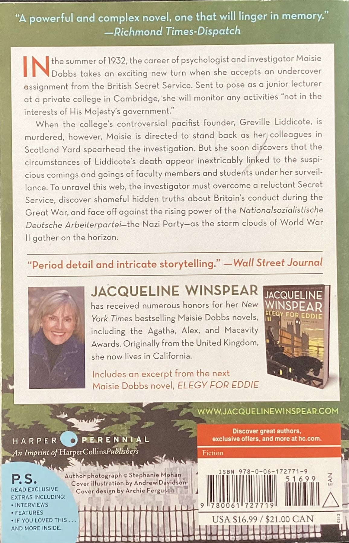 Maisie Dobbs, the brave, insightful, and compassionate heroine of Jacqueline Winspear's mystery series, has a lock on the hearts of readers.